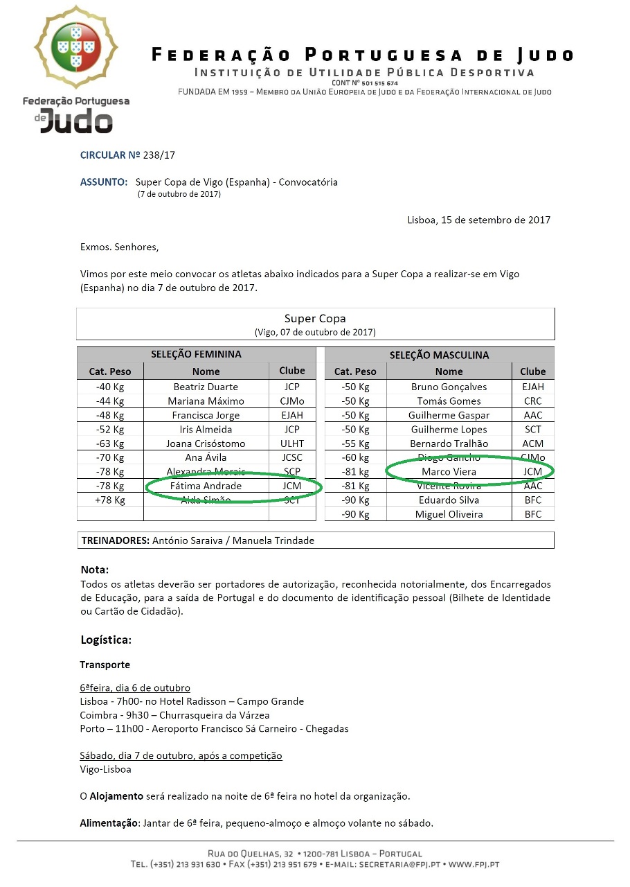 Os Judocas Marco Vieira e Leonor Gomes, apesar de ainda serem atletas juvenis, irão participar no escalão de cadetes visto que a partir de janeiro serão atletas desta categoria.